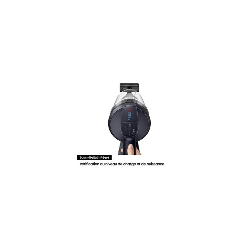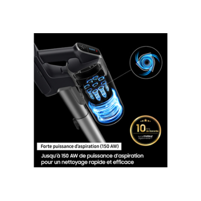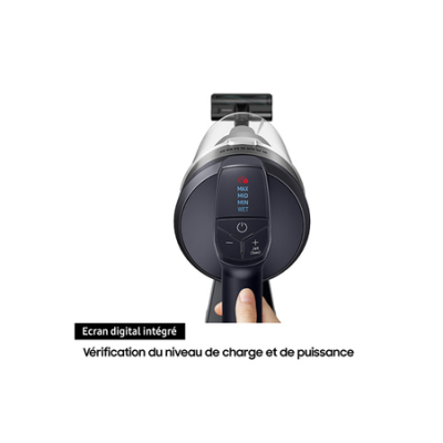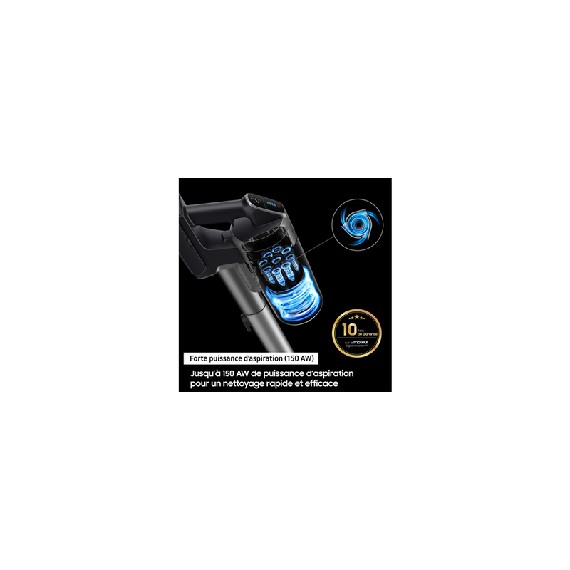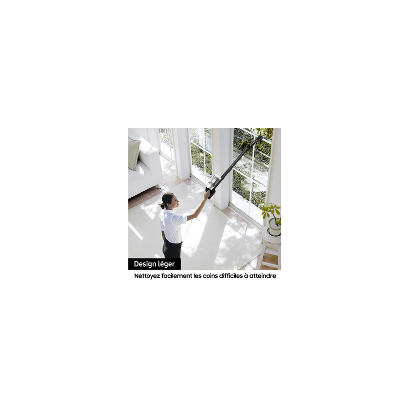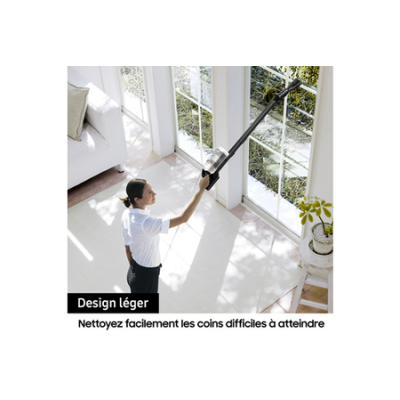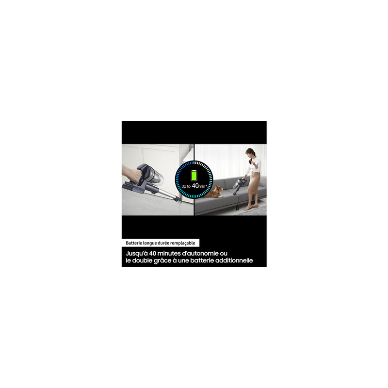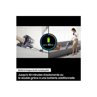 L'aspirateur est équipé d'une batterie longue durée et remplaçable, offrant une utilisation optimale sans nécessité de recharge supplémentaire. Grâce à la batterie Samsung intégrée, vous pouvez profiter d'un temps d'utilisation standard allant jusqu'à 40 minutes.