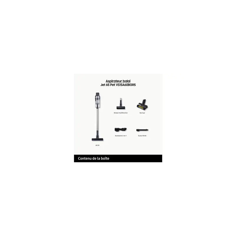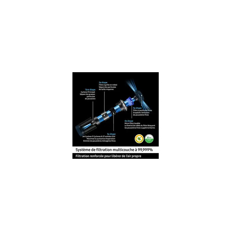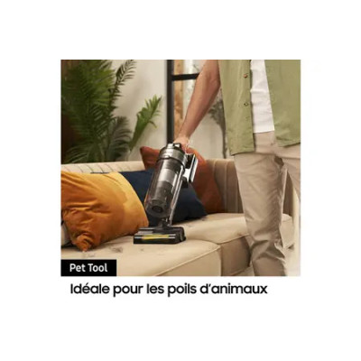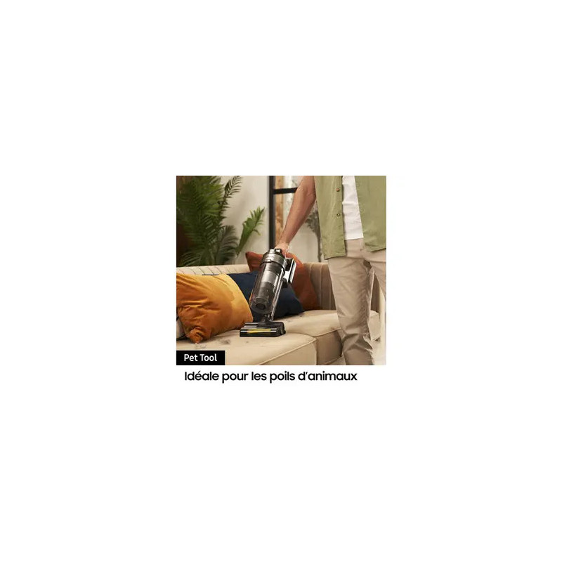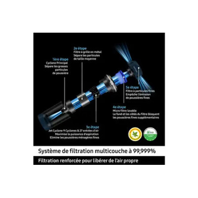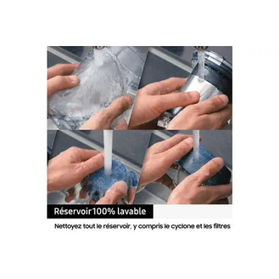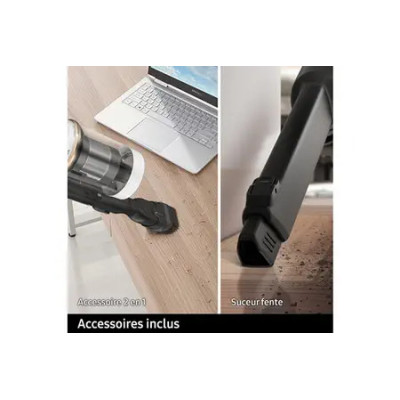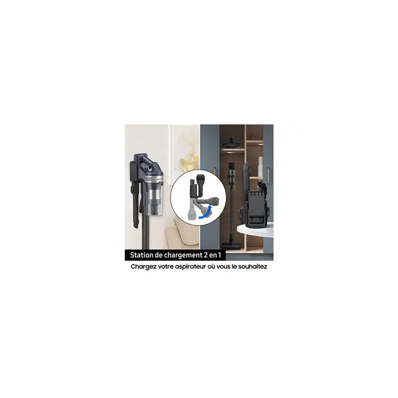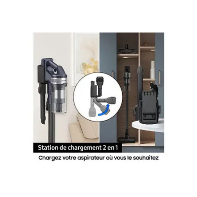 L'aspirateur est équipé d'une batterie longue durée et remplaçable, offrant une utilisation optimale sans nécessité de recharge supplémentaire. Grâce à la batterie Samsung intégrée, vous pouvez profiter d'un temps d'utilisation standard allant jusqu'à 40 minutes.