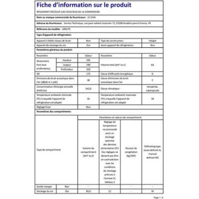 | Caractéristiques complémentaires | - Cadre de la porte : vitrée noire - Porte triple vitrage, traité anti-UV - Eclairage intérieur avec interrupteur -