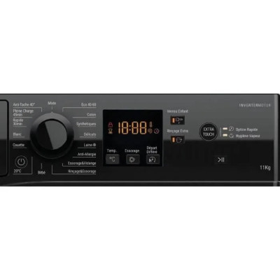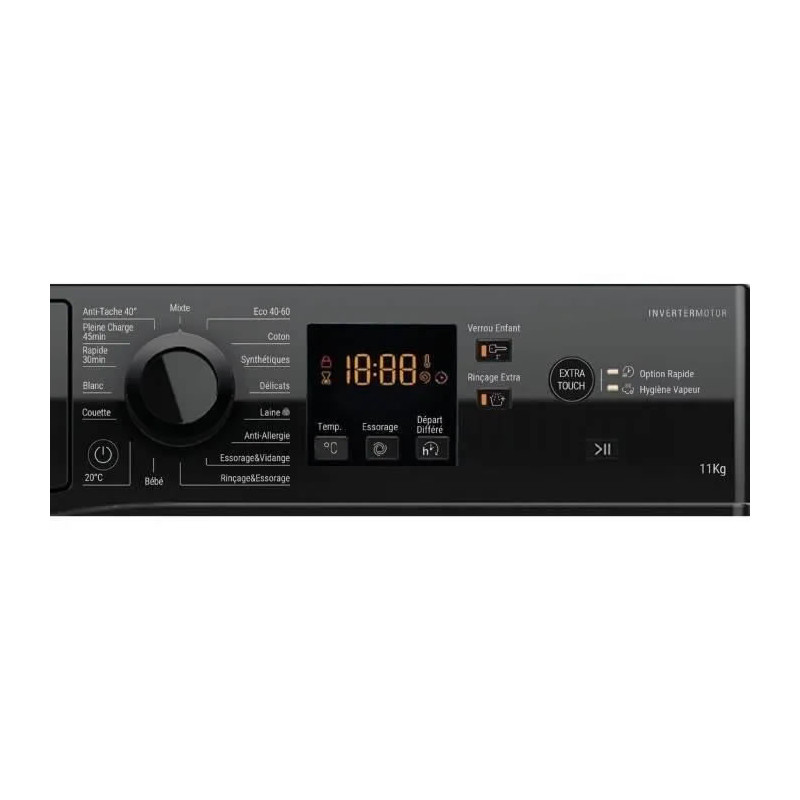 Programmes : mixte, éco 40-60, coton, synthétiques, délicats, laine, anti-allergie, bébé, 20°C, couette, blanc, rapide 30 min, pleine charge 45min, anti-tâche 40°, essorage et vidange, rinçage et essorage Options et touches : on/off, start/pause, hygiène vapeur, départ différé (24h), rinçage extra, rapide, vitesse d'essorage, réglage température |