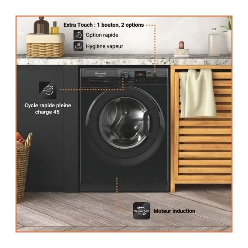 Option rapide : réduit la durée du cyle jusqu'à 50% lors de la sélection du programme, vous permettant ainsi d'adapter la durée du cycle à votre mode de vie Option hygiène vapeur : purifie vos vêtements lors de vos cycles en éliminant 99,9% des bactéries Moteur induction : réduit les vibrations et le niveau de bruit émis par l'appareil. Plus résistant, il augmente la durée de vie du lave-linge Anti-tâche 40° : gagnez du temps en enlevant les taches à 40°, sans prétraitement, pour des résultats de lavage toujours optimaux |