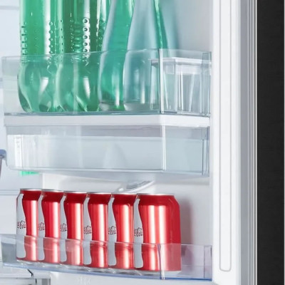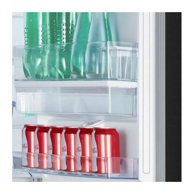 Avec une capacité totale de 304 litres, ce réfrigérateur est conçu pour une utilisation silencieuse grâce à un niveau sonore de 39 dB. Le froid ventilé (No Frost) dans le réfrigérateur et le congélateur assure une absence totale de givre, facilitant l’entretien. Ce modèle couleur noir dispose de trois clayettes en verre avec une porte réversible pour s’adapter à toutes les cuisines. Compact, avec des dimensions de 59,5 cm de largeur, 186 cm de hauteur et 59 cm de profondeur, il est idéal pour optimiser l’espace. Sa consommation annuelle de 243 kWh en fait un modèle économique, avec une autonomie de 10 heures en cas de coupure de courant. Il bénéficie d’une garantie de 2 ans.